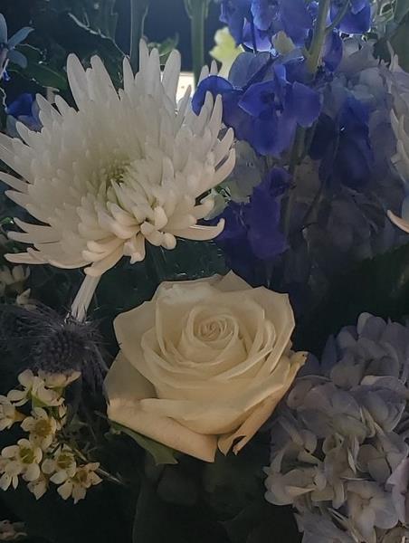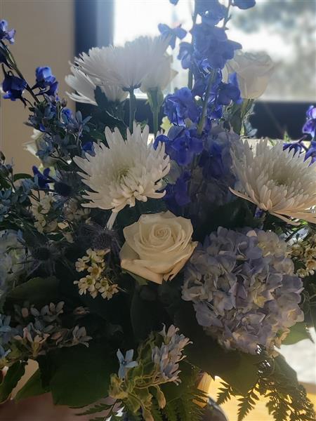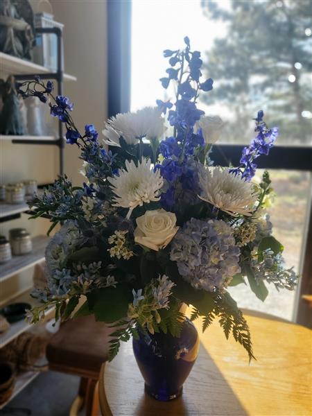 This elegant arrangement features snowy white blooms alongside soft blues and rich indigo hues. Delphinium, hydrangea, roses, and textured greens are gathered in a cobalt blue vase, making it perfect for thoughtful gestures, sympathy, or to bring calming beauty into any space. Designed and delivered fresh with care.