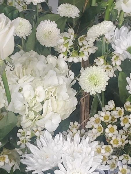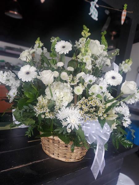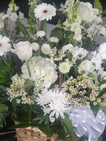 This serene white arrangement features roses, mums, and snapdragons, beautifully presented in a woven basket. A timeless tribute or elegant gift. Available for local flower delivery.